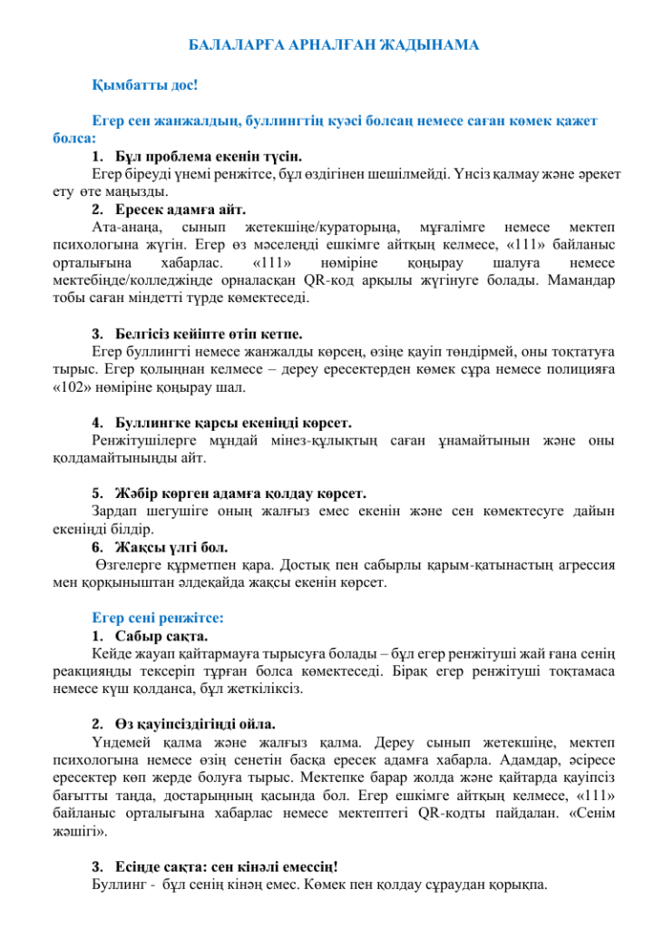 Қымбатты оқушылар! Кез-келген уақытта қиындыққа тап болсаңыз, мына жадынама есіңізде болсын!
