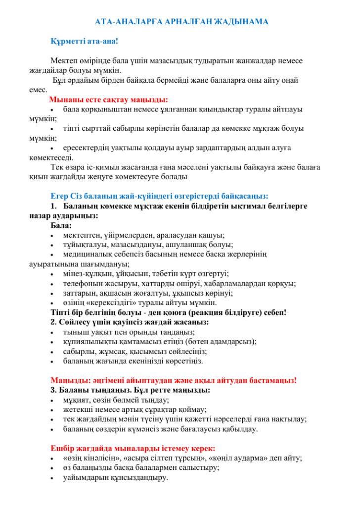 Құрметті ата-аналар! Кез-келген уақытта балаңыз қиындыққа тап болса, мына жадынама есіңізде болсын!